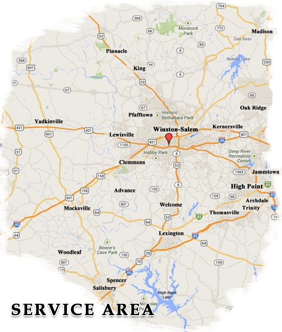 Advance, Belews Creek, Clemmons, Colfax, Cooleemee, Danbury, East Bend, Farmington, Franklin, Hamptonville, Harmony, High Point, Houstonville, Jamestown, Kernersville, King, Lewisville, Lexington, Mocksville, Mt. Airy, Oak Ridge, Pfafftown, Pilot Mountain, Pinnacle, Quaker Gap, Rural Hall, Shacktown, Siloam, Silver Valley, Statesville, Stokesdale, Thomasville, Tobaccoville, Trinity, Turnersburg, Union Cross, Wallburg, Walnut Cove, Welcome, Winston-Salem, Woodleaf, Yadkinville, and more…